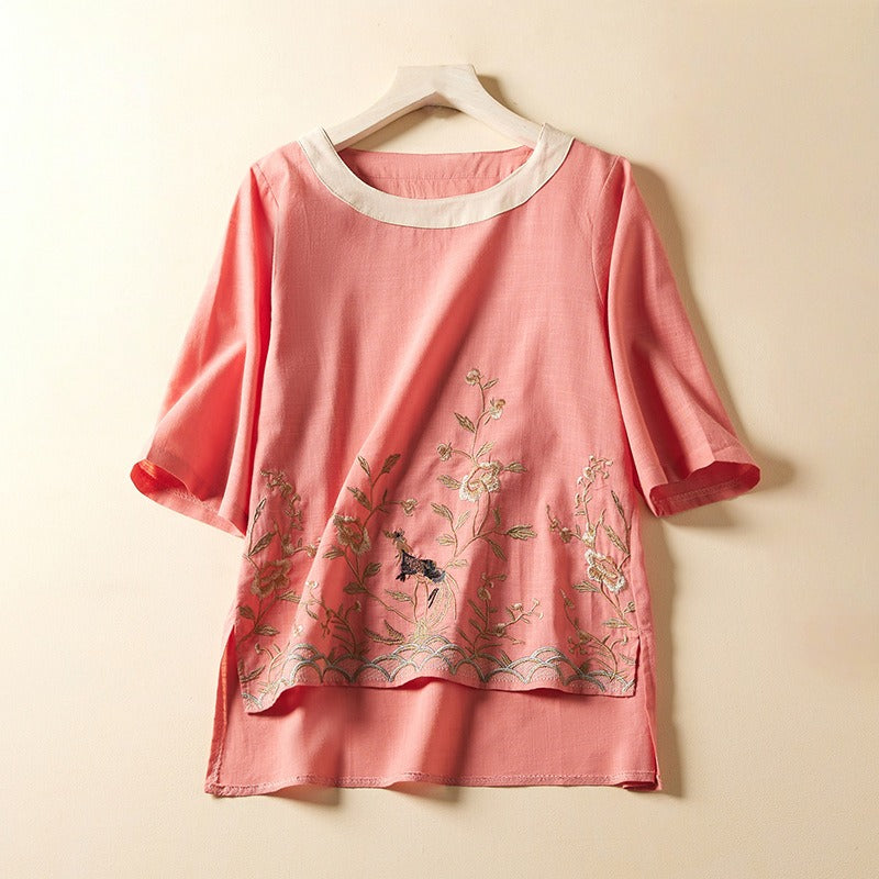 Crafted from gauzy linen, this shirt features a folkloric embroidery that tells a story of the wild. The high-low hem and ethereal shape create a look of wandering wonder, a true bohemian piece for your collection.